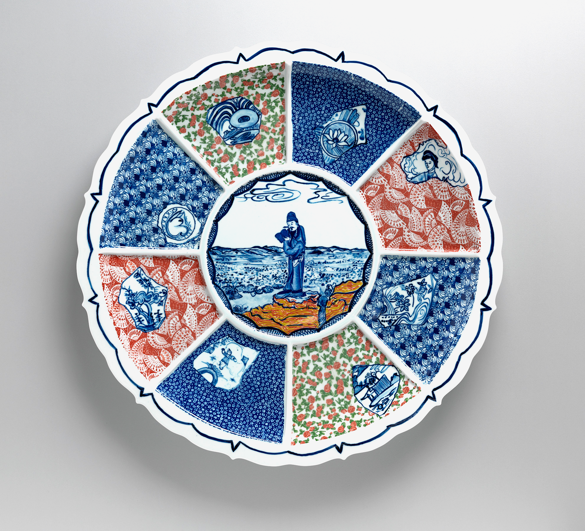 In Self Portrait as Li Bai, surrounded by eight Auspicious Shards (2016), the artist imagines himself as the great 8th century poet Li Bai, ruminating on the romantic and poetic nature of landscape. In the costume of the poet, he stands alone on a rock surrounded by eight partitioned glimpses into his life. Subtly masked as Chinese symbols, the love struck rabbit looks across to the Goddess of the Moon with each shard portraying a personal wish for love, home and happy marriage. (Julianne Pearce, 2018)